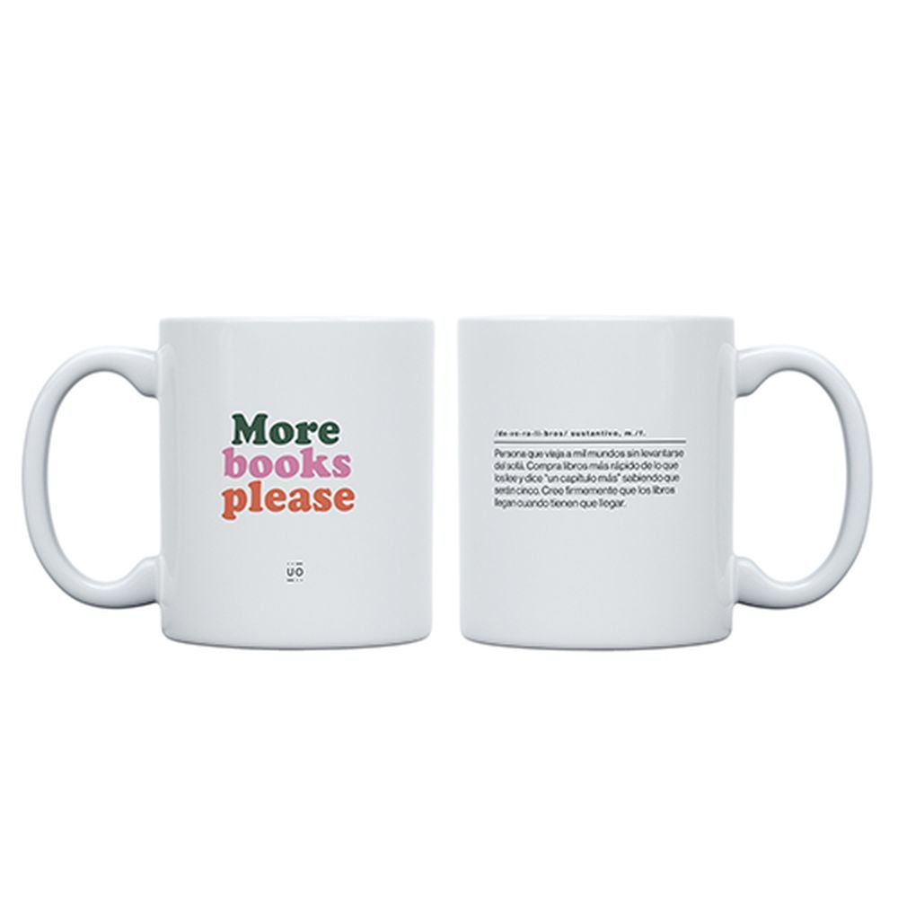 🍭Taza More Books: Taza en cerámica de 350 ml. Prepara tu bebida favorita y disfruta en esta taza con el texto More Books, Please por un lado y una definición por la otra parte de “Devoralibros”.