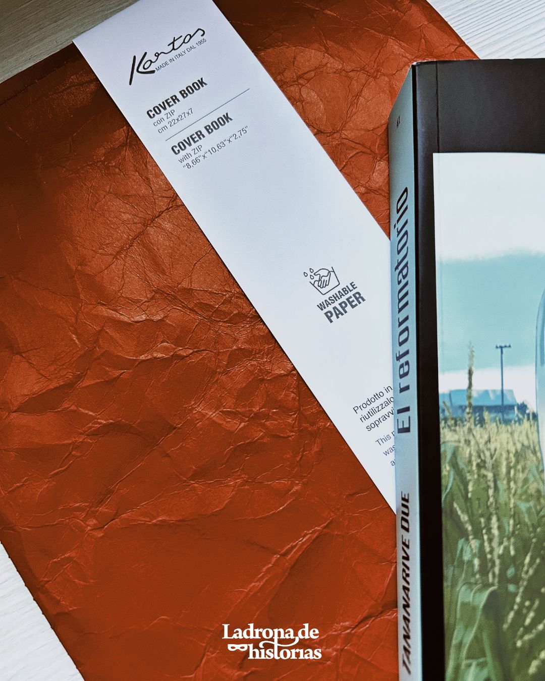 🫀Funda para libro realizada en papel lavable. Original funda con cierre de cremallera. Un complemento ideal y especial para llevar una lectura como esta. Color rojo. Marca Kartos (Italia).